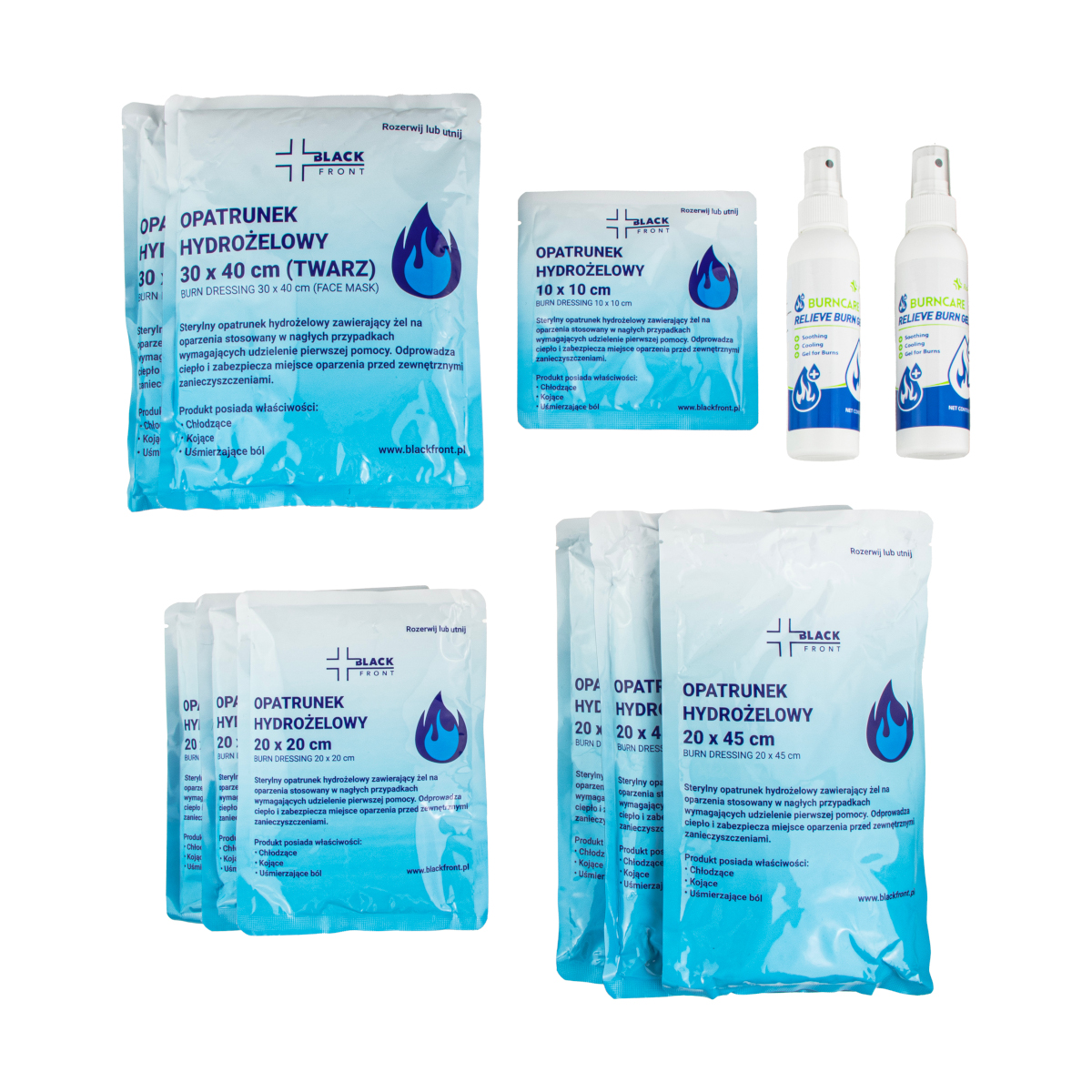 Zestaw zawiera 2 sztuki opatrunków hydrożelowych na twarz, 2 sztuki opatrunków w żelu o pojemności 120 ml oraz opatrunki hydrożelowe w formie kompresów o łącznej powierzchni 4000 cm2.
