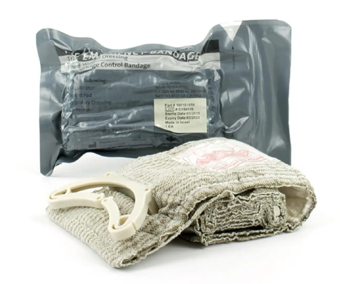 Opatrunek składa się z elastycznego bandaża w kolorze oliwkowym, do którego przytwierdzona jest plastikowa klamra. Jej zastosowanie daje wiele możliwości m. in. takich jak bezproblemowa zmiana kierunku bandażowania, czy też uzyskanie punktowego ucisku dokładnie w okolicach rany zwiększając efektywność tamowania krwawienia. Ponadto, klamra pozwala na szybkie zapięcie bandaża minimalizując szanse jego niekontrolowanego poluźnienia. Do opaski przymocowany jest także wysokochłonny kompres o wymiarze 15 x 23 cm, który skutecznie absorbuje krew i inne płyny organiczne. Na bandażu umieszczono przeszycia, które uniemożliwiają przypadkowe rozwinięcie.