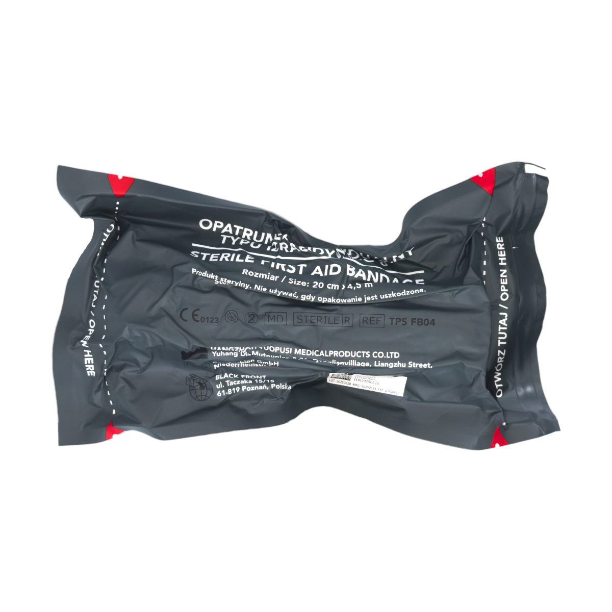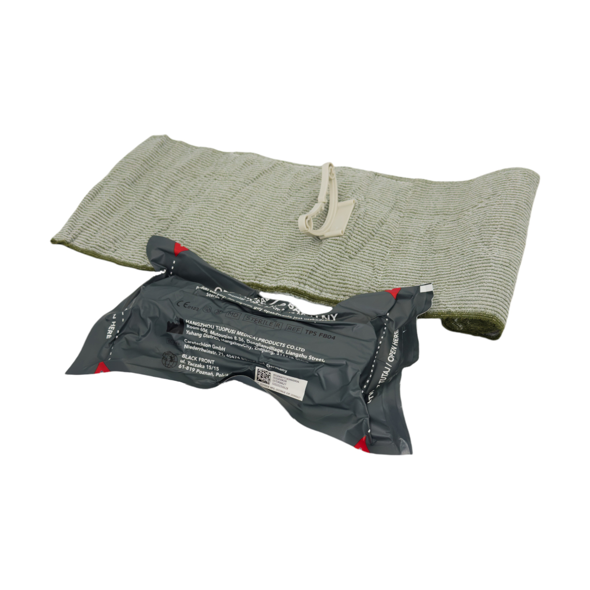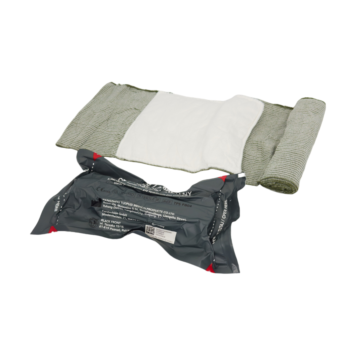 Opatrunek osobisty typu izraelskiego w wersji militarnej (kolor zielony) oferowany w próżniowym, hermetycznym opakowaniu. Produkt cechuje prostota zastosowania dlatego dedykowany jest zarówno zawodowym ratownikom jak i osobom niezwiązanym z profesjonalnym ratownictwem. To sprawdzony produkt przy udzielaniu pierwszej pomocy, który posiada plastikowy element dociskowy, dzięki czemu tamuje efektywnie masywne krwotoki zanim poszkodowany trafi do szpitala. Opatrunek pełni funkcje: opatrunku osobistego, uciskowego i wspomagającego.