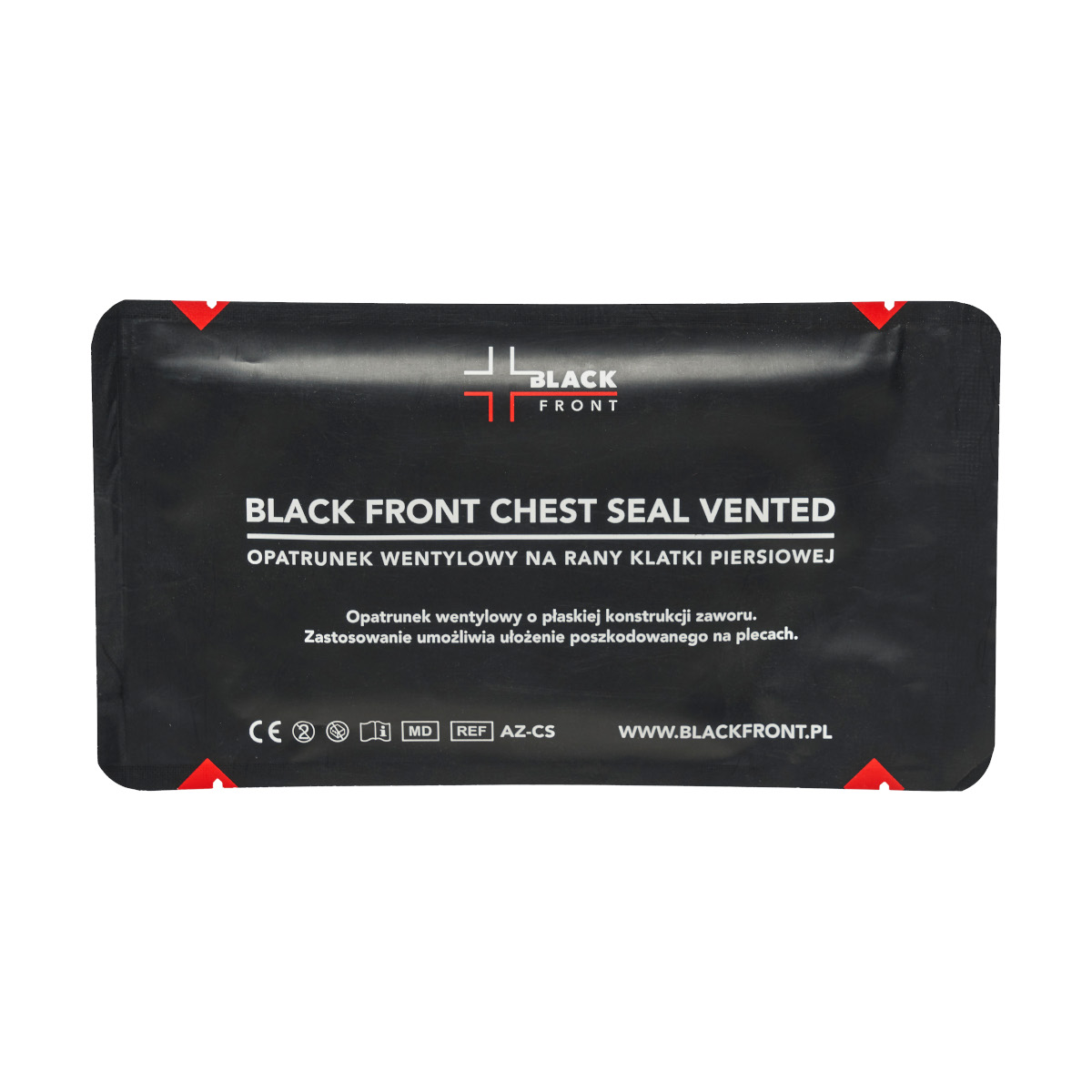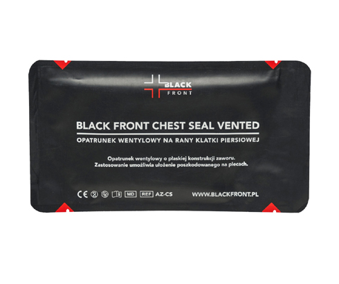 BLACK FRONT Chest Seal Vented to opatrunek wentylowy o płaskiej konstrukcji zaworu przeznaczony do opatrywania ran w obrębie klatki piersiowej. Jednokierunkowa konstrukcja zaworu umożliwia jednocześnie wypuszczanie powietrza zalegającego w klatce piersiowej, zmniejszając tym samym ryzyko wystąpienia odmy prężnej oraz blokuje dostęp powietrza z zewnątrz.
