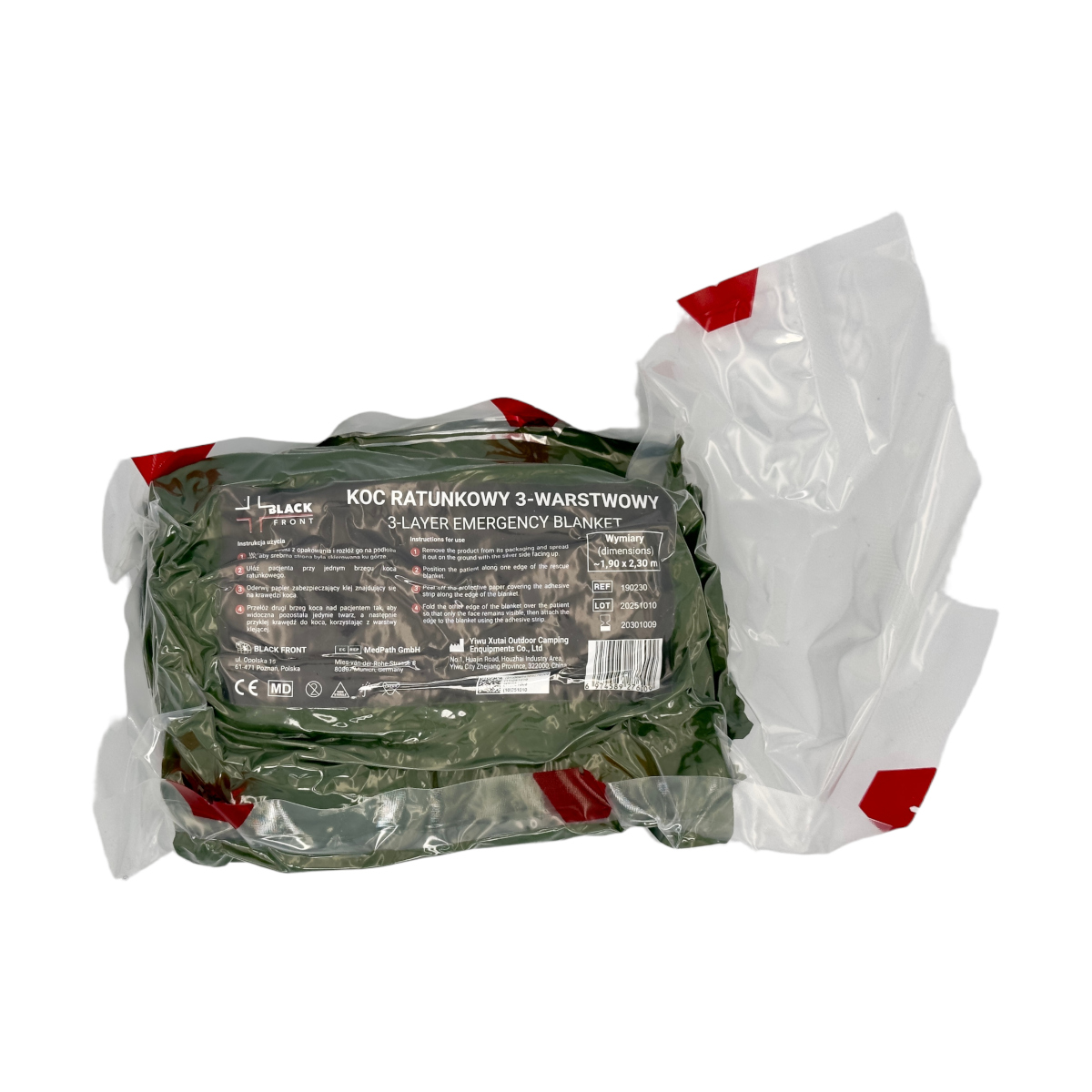 Koc ratowniczy Black Front to wysokiej jakości trójwarstwowy koc termoizolacyjny, zaprojektowany z myślą o zapewnieniu skutecznej ochrony termicznej pacjenta w warunkach kryzysowych i ekstremalnych. Dzięki przemyślanej konstrukcji chroni przed wychłodzeniem, działaniem wiatru i wody, a także spełnia wymagania profesjonalnych użytkowników – ratowników medycznych, służb mundurowych oraz organizacji niosących pomoc.