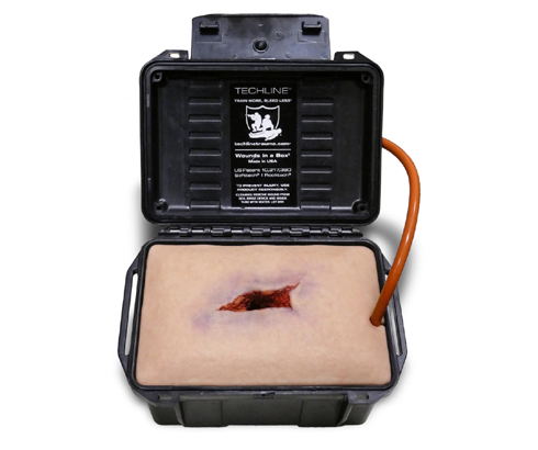 Trenażer tamowania krwotoku Shrapnel Wound in a Box® firmy Techline Technologies to realistyczny symulator rany odłamkowej tkanek miękkich, przeznaczony do nauki i doskonalenia techniki pakowania ran oraz kontroli masywnego krwotoku podczas szkoleń medycznych i taktycznych. Model pozwala prowadzić praktyczne ćwiczenia z zakresu postępowania w przypadku ciężkich urazów, odwzorowując strukturę i zachowanie prawdziwych tkanek.